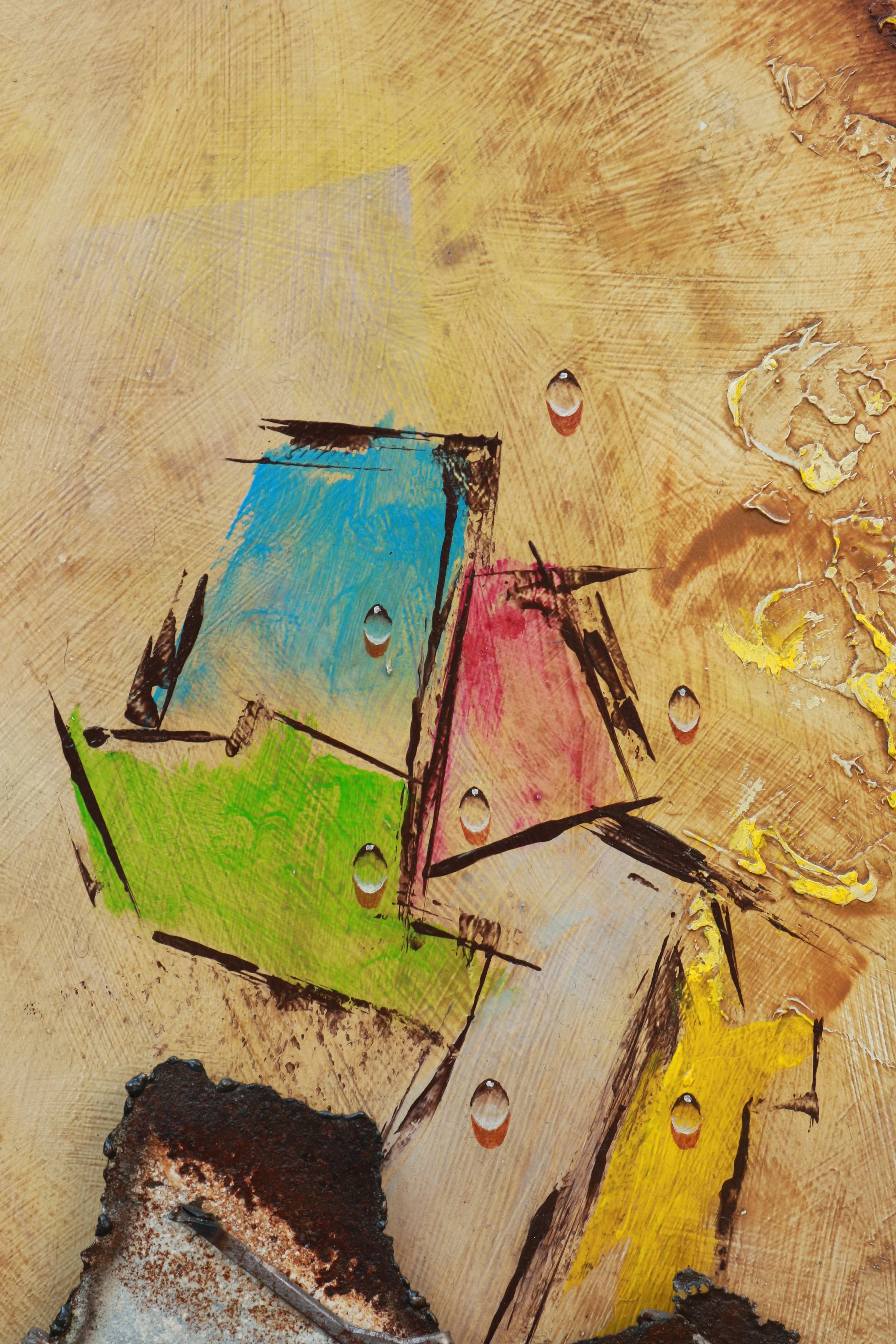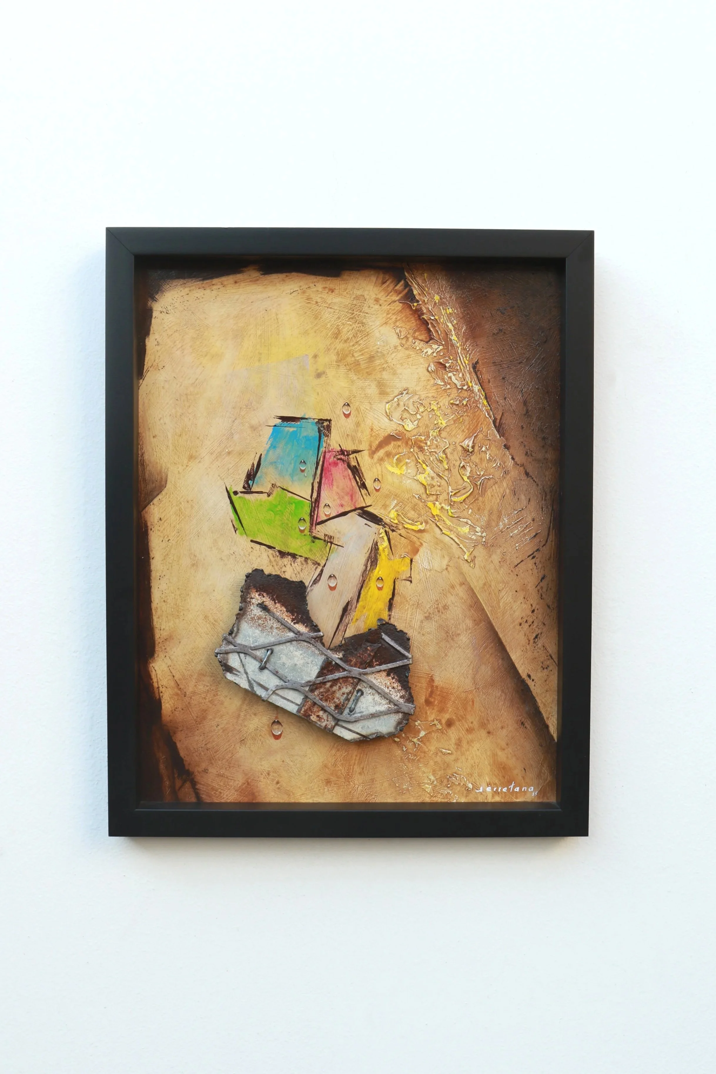 Montaje metálico, acrílico ,óleo sobre base MDF con cubierta de látex y gesso
