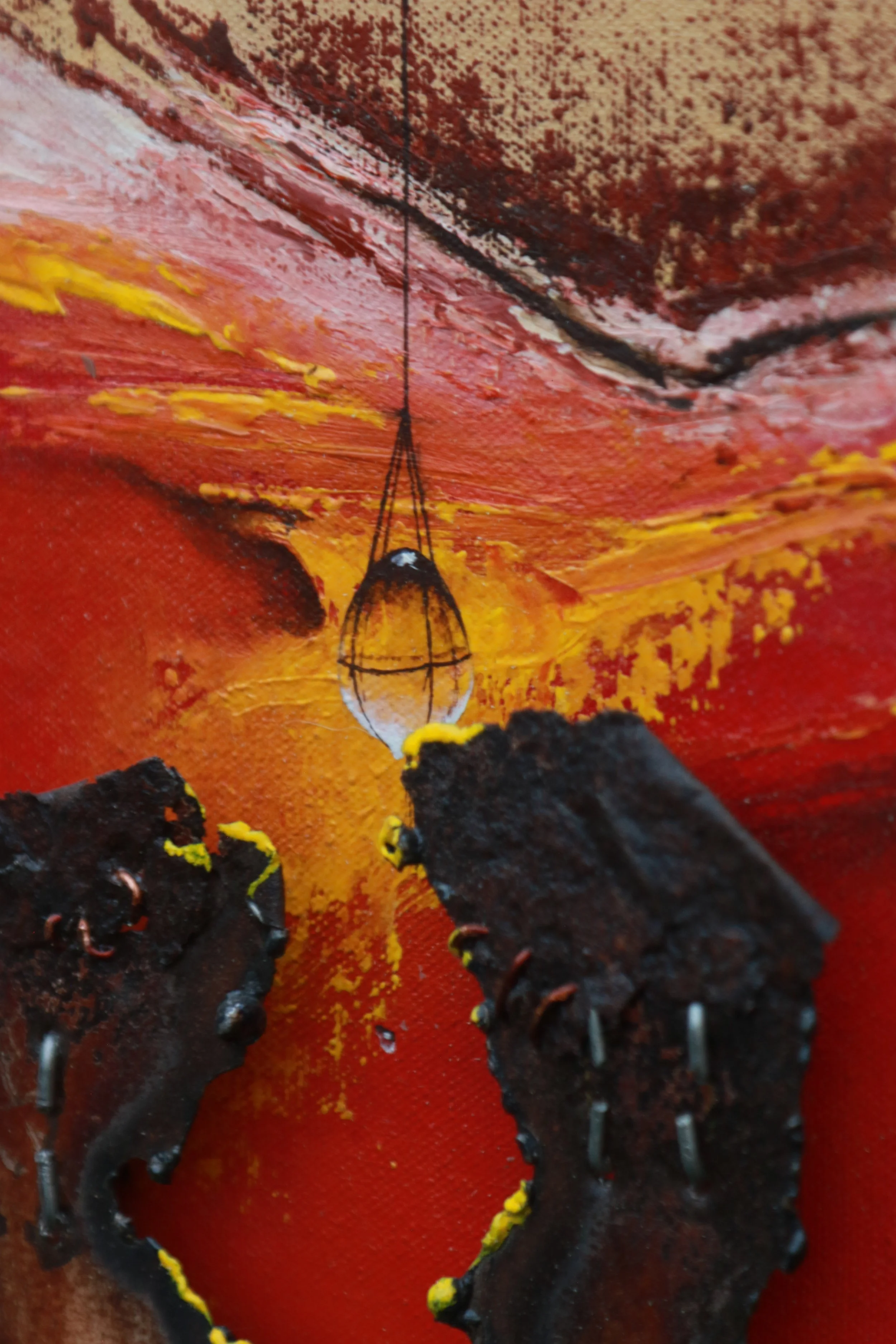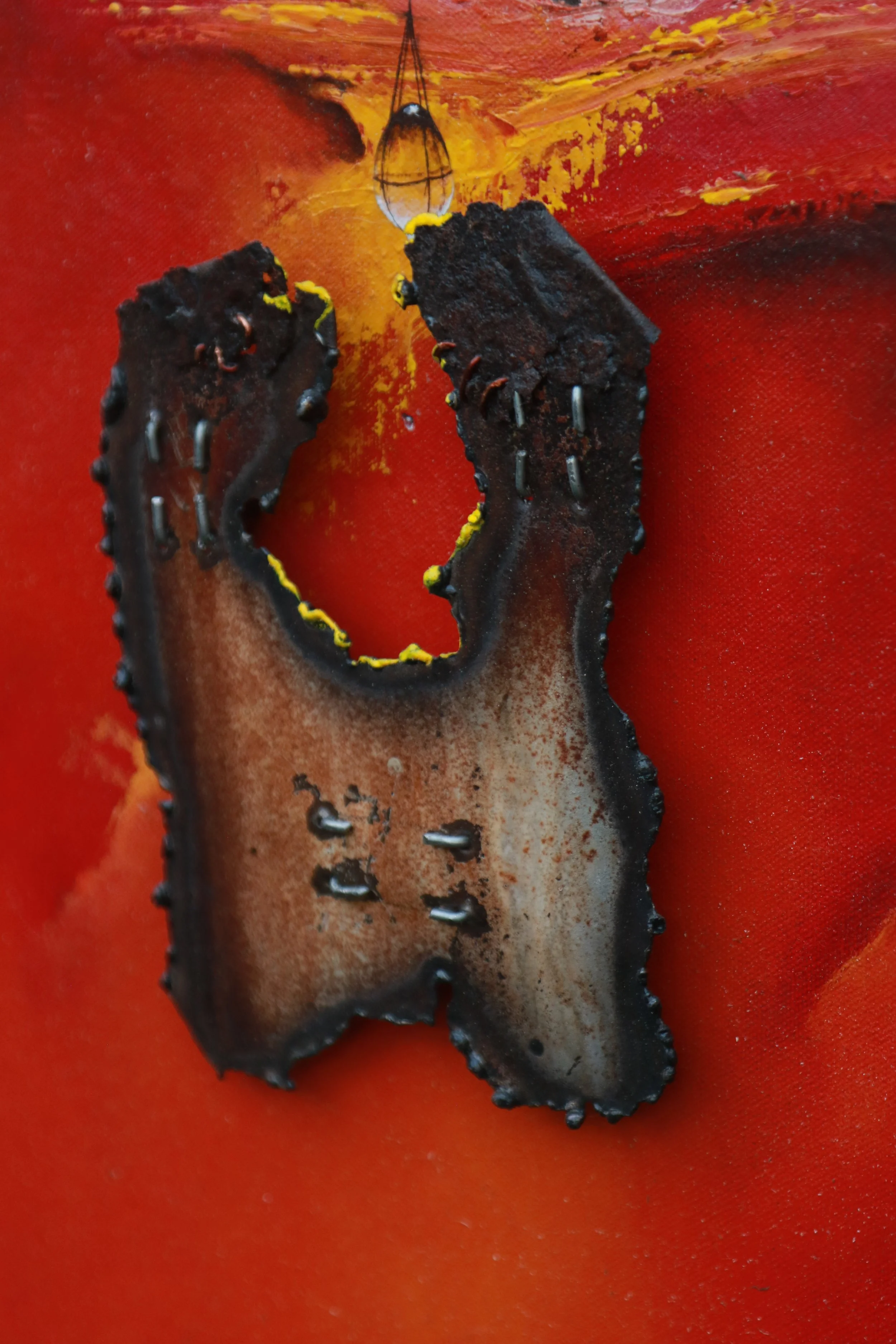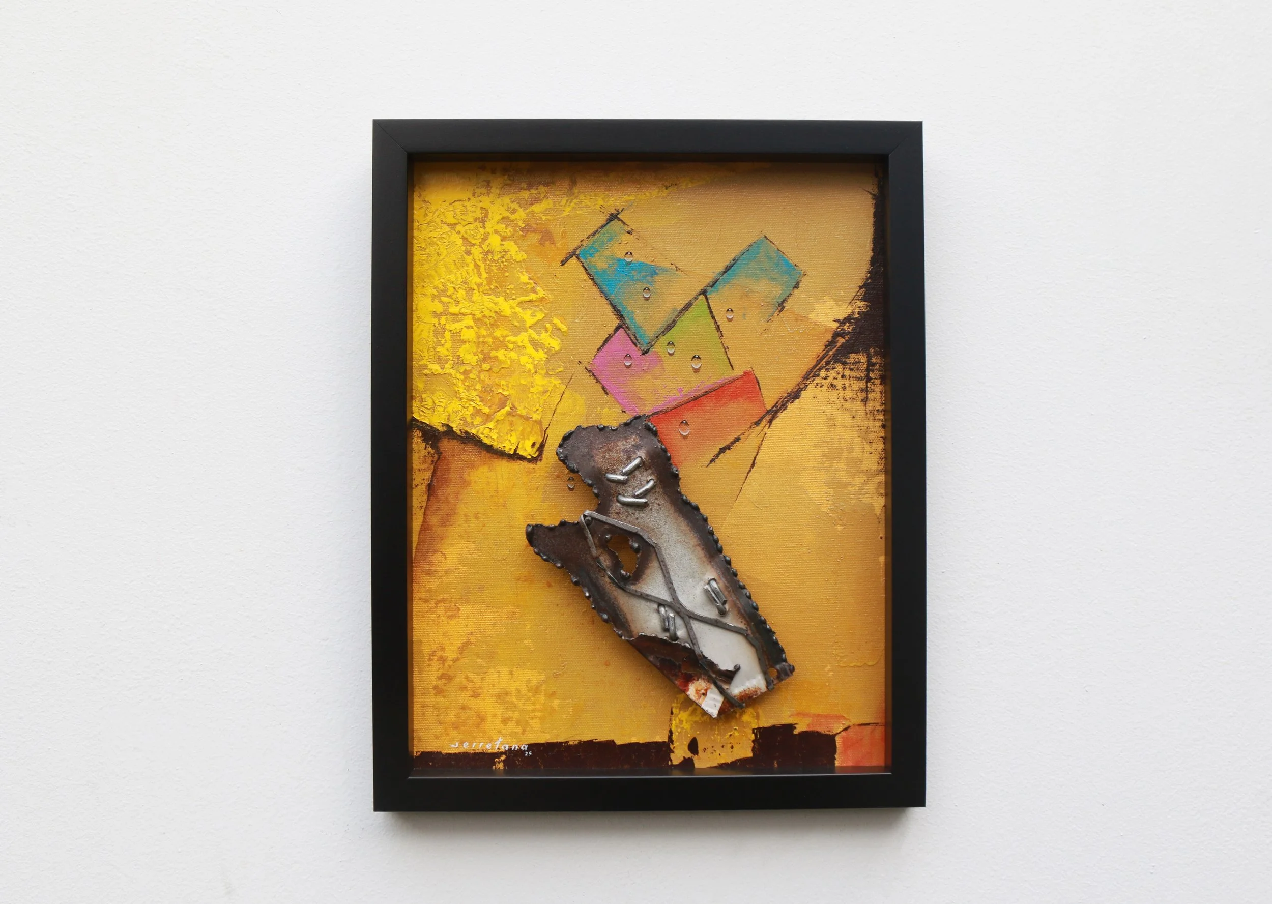 Montaje metálico, acrílico ,óleo sobre canvas de algodón con látex y gesso montada en material MDF