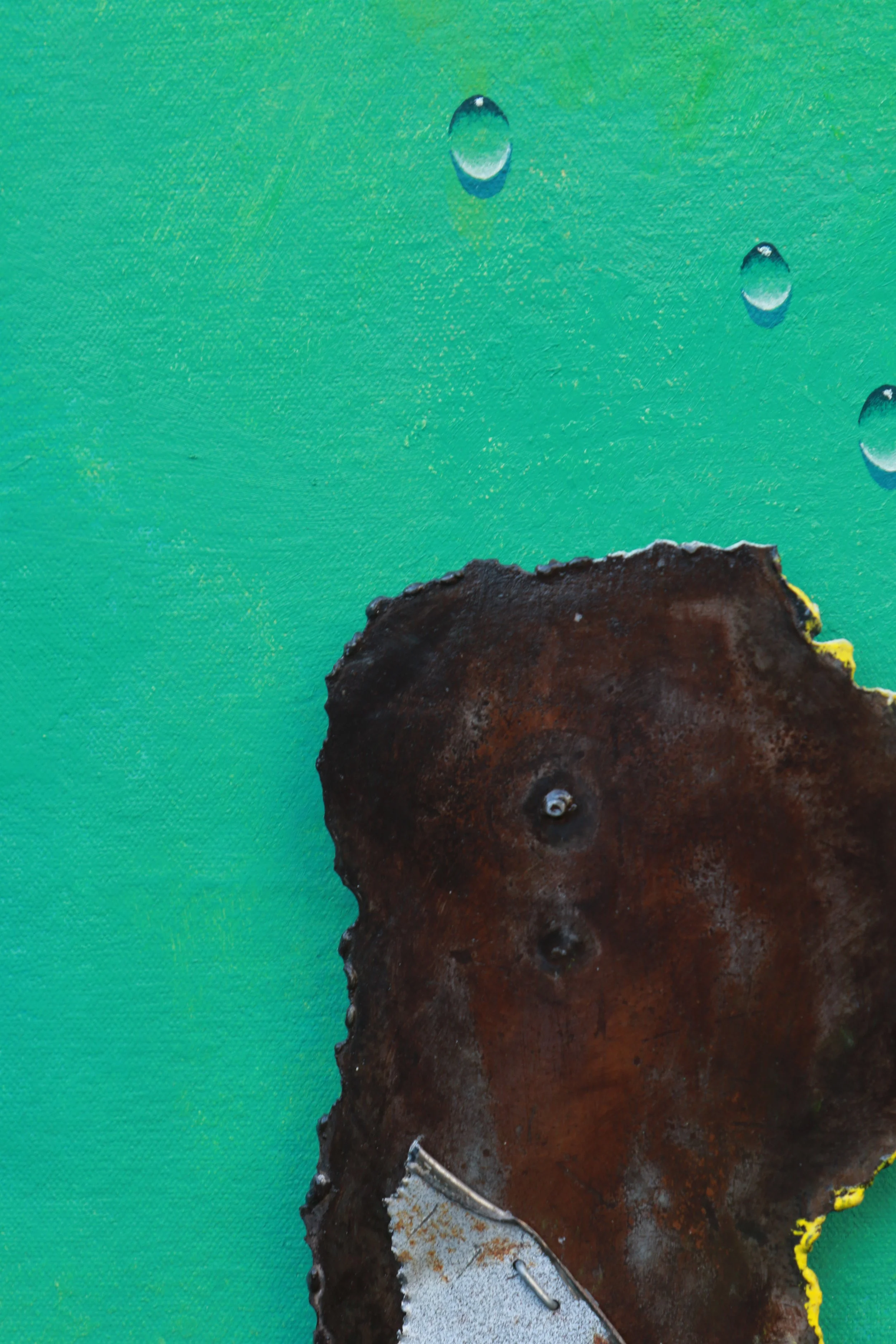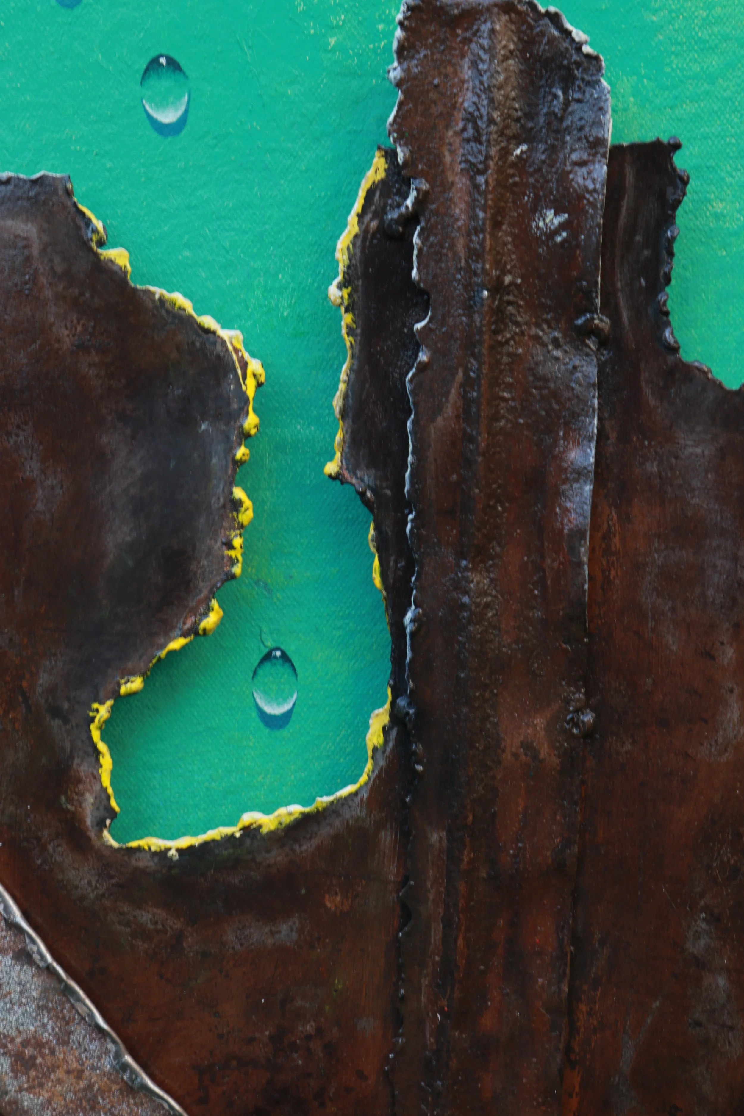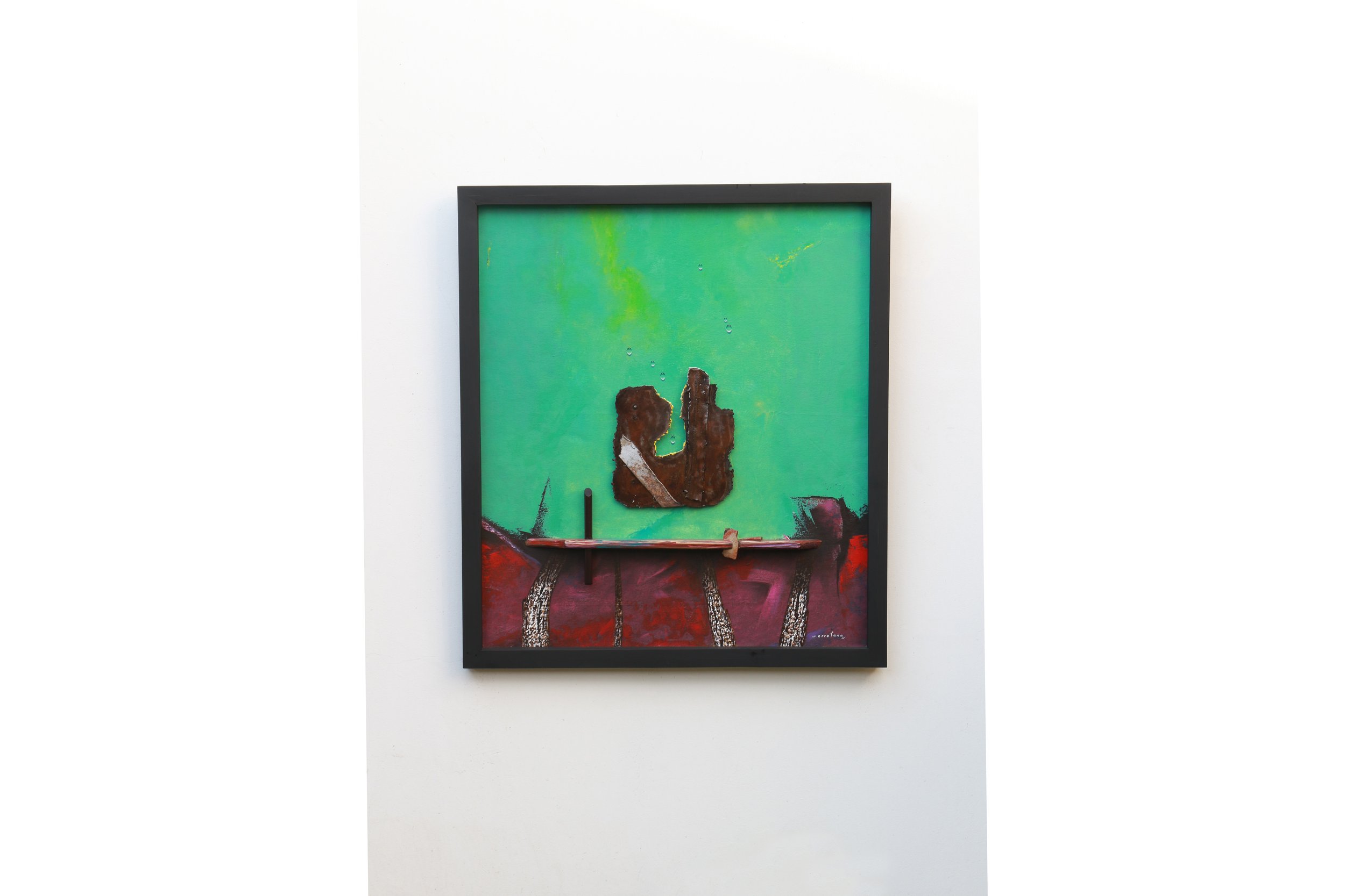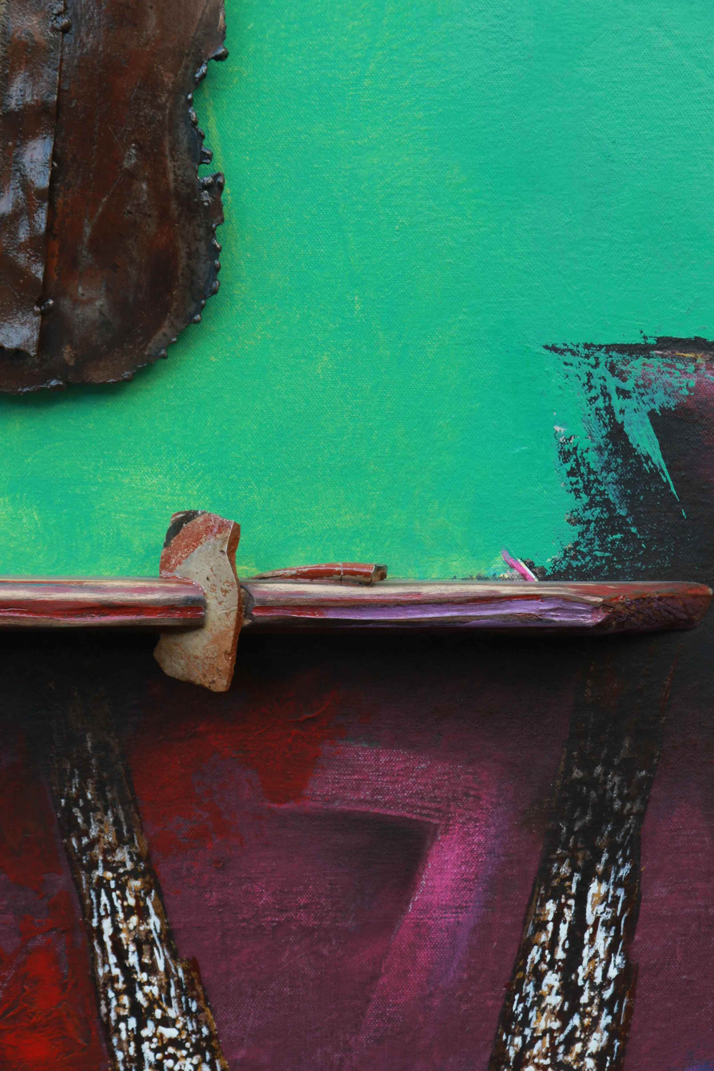 Montaje metálico, madera y cerámica precolombina, acrílico, óleo sobre canva de algodón con látex y gesso montada en material MDF
